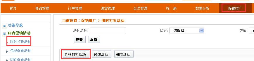 路径:促销推广》限时打折活动 (注意:若进入是空白,请查看浏览器广告拦截设置,请把拦截去掉)