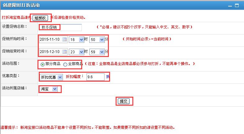 开始和结束时间,优惠类型(有按折扣优惠和减价优惠二种方式)及折扣,店铺选择后,点击“提交”