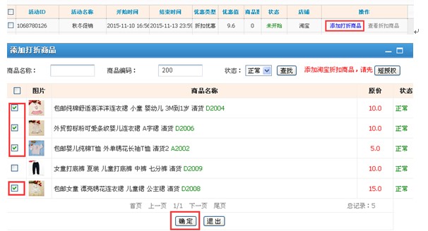 2、 在活动列表中,点击“添加打折商品”。在添加打折商品页面,对要打该折扣的商品勾选好后,点击“添加”,