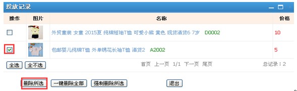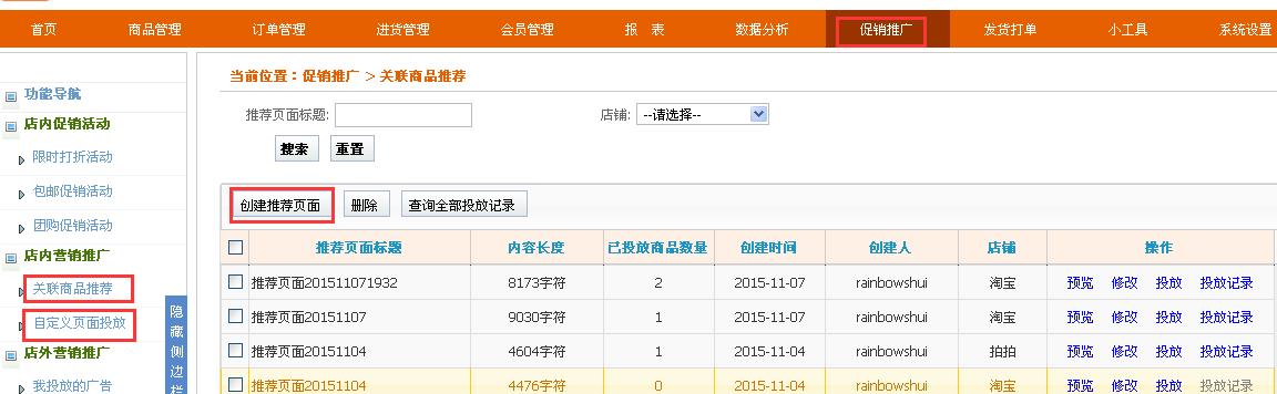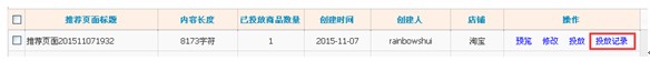 3、推荐页面的删除:在推荐页面列表中,点击“投放记录”,进入投放记录页面,勾选上要删除推荐页面的商品后,