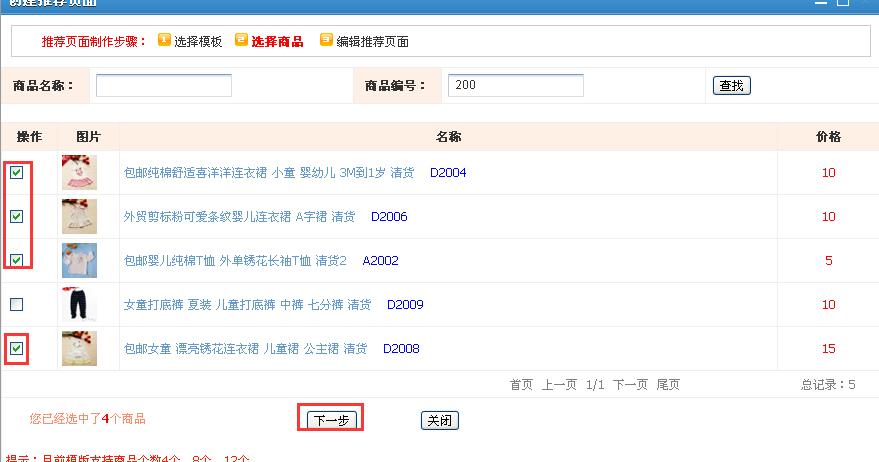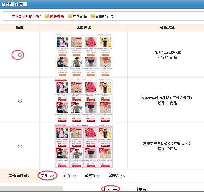 1) 点击“创建推荐页”,进入模板选择页面,选好模板和店铺后,点击“下一步”。
