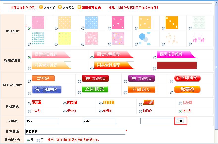 3)进入推荐页面编辑页面,模板背影,购买按钮等选好后,点击“OK”,