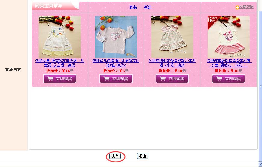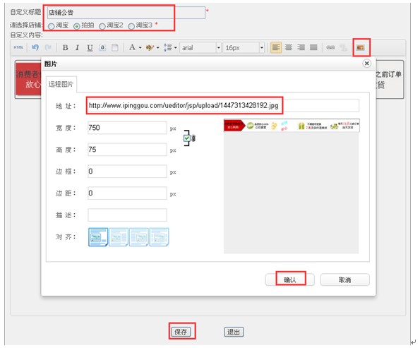 进入创建自定义推荐页面,首先填上标题和店铺选择,然后在自定义内容中编辑文字说明(也可以插入网络图片)后,