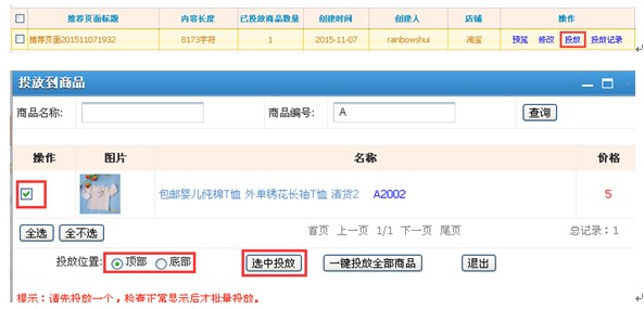2、推荐页面的投放:在推荐页面列表中,点击“投放”, 进入投放商品页面,勾选上要投放的商品和投放位置后,
