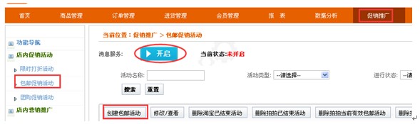 点击“保存”后,返回到包邮活动列表页面,点击“开启”。