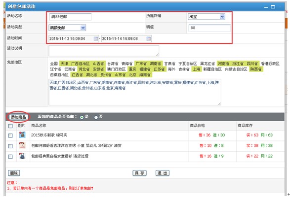 另外可以添加商品,只针对添加的商品设置包邮或不包邮。