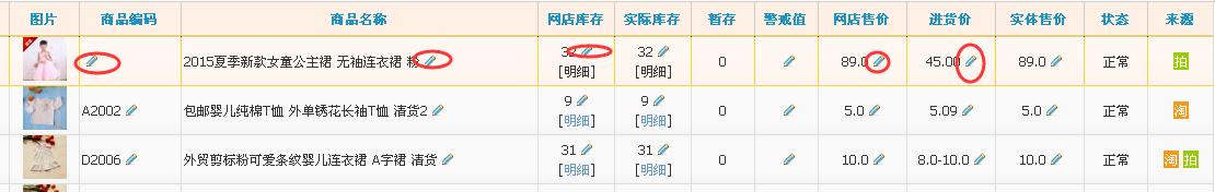进入商品列表页面,点对应的笔可以对商品编码,标题,库存,存警戒值,进货价,销售价进行修改。