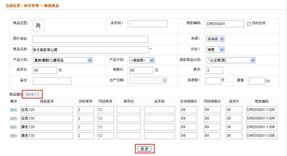 进入新建商品页面,录入商品数据(标题,价格,属性,库存等)后保存。