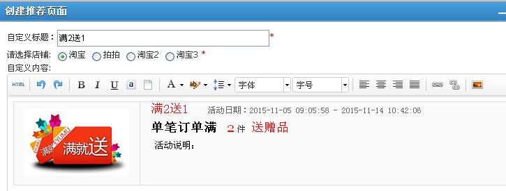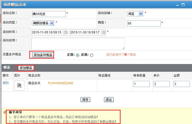 1、点击“创建赠品活动”,进入活动设置页面,带红*是必填项,有满额送和满件送二种方式。
