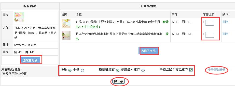 分别添加主商品和子商品,并设置好比例关系数,以及库存联动参数设置后,点击“保存”。