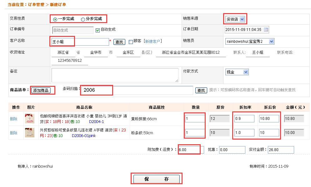 进入新建订单页面,填写完订单相关(交易性质,销售店铺,客户资料,销售员,商品及数量,以及折扣和邮费等) 数据后,点击“保存”。 说明:1)对已有的客户,直接录入姓名或电话就可搜索查出。 2)商品可以通过关键字,或编码直接查找,也可以通过“添加商品”页面选择添加。 3)一步完成是指订单保存后,订单状态直接是确认收货完成;分步完成是指订单保存后, 订单状态是待付款,需要在“订单列表”中分别点击:付款,发货,完成。