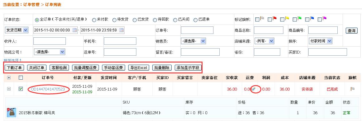 说明:1)提供各种方式的查询功能 2)“关闭订单”库存补回,在销售统计中减去;“删除订单”库存不补回,在销售统计中减去。 3)“批量调整运费”是对勾选的订单调整统一的运费值。也可以点订单中运费旁边的笔,对单个订单调整运费。 (运费调整只影响利润的计算和快递对帐报表,不影响淘宝订单中的运费) 4)“手动套运费”是可以对在某一个时间段或选中的订单,按指定运费模板套运费。 (运费调整只影响利润的计算和快递对帐报表,不影响淘宝订单中的运费) 5)点击订单号,进入订单编辑页面,可以对订单中的商品增加或删除,保存后相应商品库存变化 (即删除或减少的库存加回,增加或添加的库存减少)。
